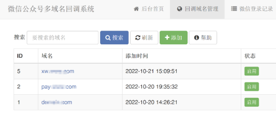 基于ThinkPHP6框架微信公众号多域名授权回调系统源码微信公众号后台默认只能授权2个网页域名,用本系统突破这个限制,用同一个公众号对接无限多个网站。网站后台支持回调域名白名单的管理,以及登录记录的查看。